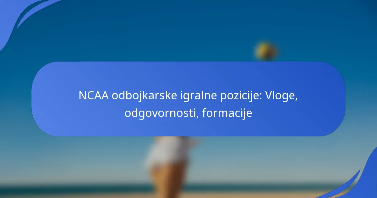 NCAA odbojka vključuje šest osnovnih položajev, vsak z edinstvenimi vlogami in odgovornostmi, ki prispevajo k skupni uspešnosti ekipe. Razumevanje teh položajev pomaga igralcem in trenerjem optimizirati strategije in postavitve med tekmami.